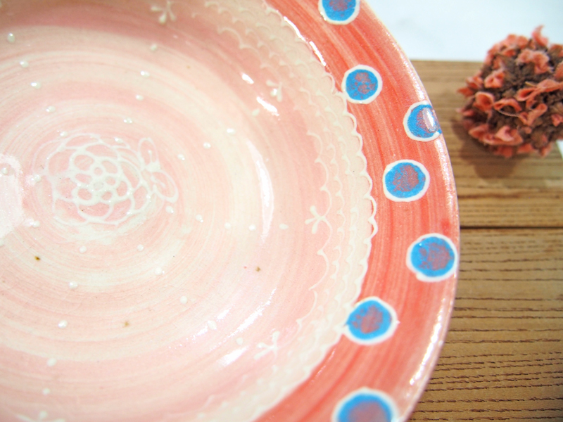 見込み部分には刷毛目の出たピンク色に彩色してから、一輪でレース模様とお花をあしらいました。