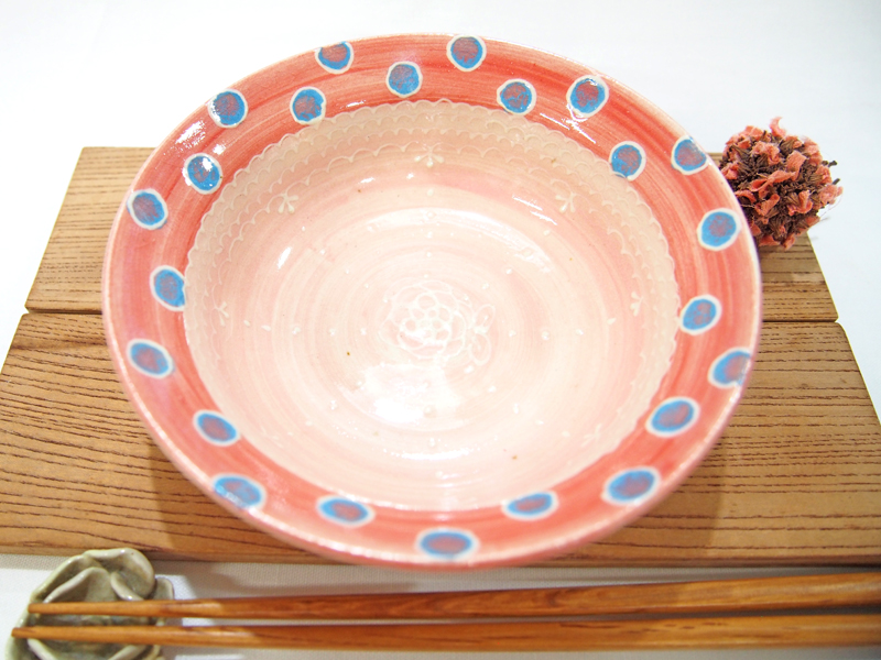 鮮やかな赤に、水色のドット模様がポップな印象の深さのある鉢です。