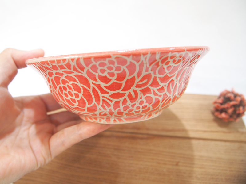 外側はシンプルに赤の化粧土で彩色してから、全面に花模様を掻き落とし(線刻)しました。