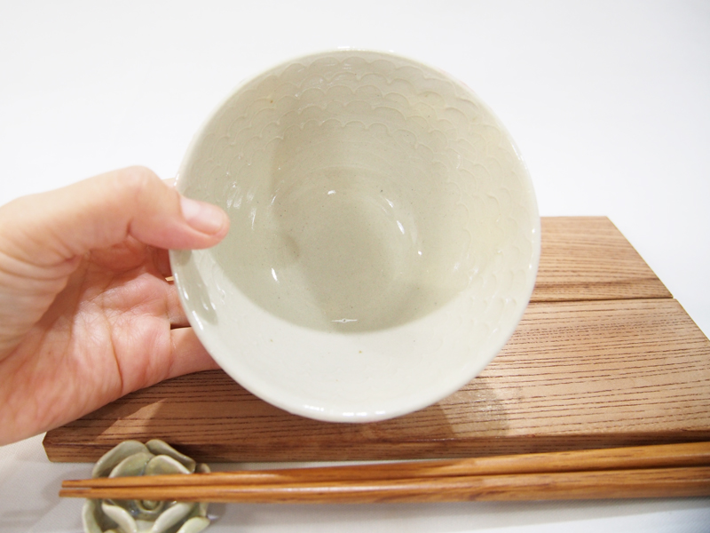 シンプルな形のごはん茶碗の、外側とに化粧土で彩色し模様を描いてから